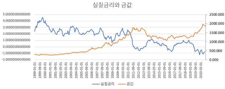 2017년-2018년 빼고는 실질금리가 상승할때 금값이 하락했음을 볼 수 있습니다.