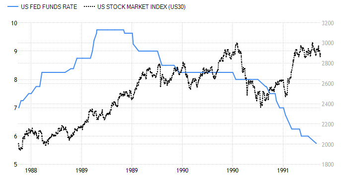 1989년은 최종기준금리인상 후 금리인하전까지 주가지수가 상승했고 물가가 4%가 넘었음을 볼 수 있습니다.
