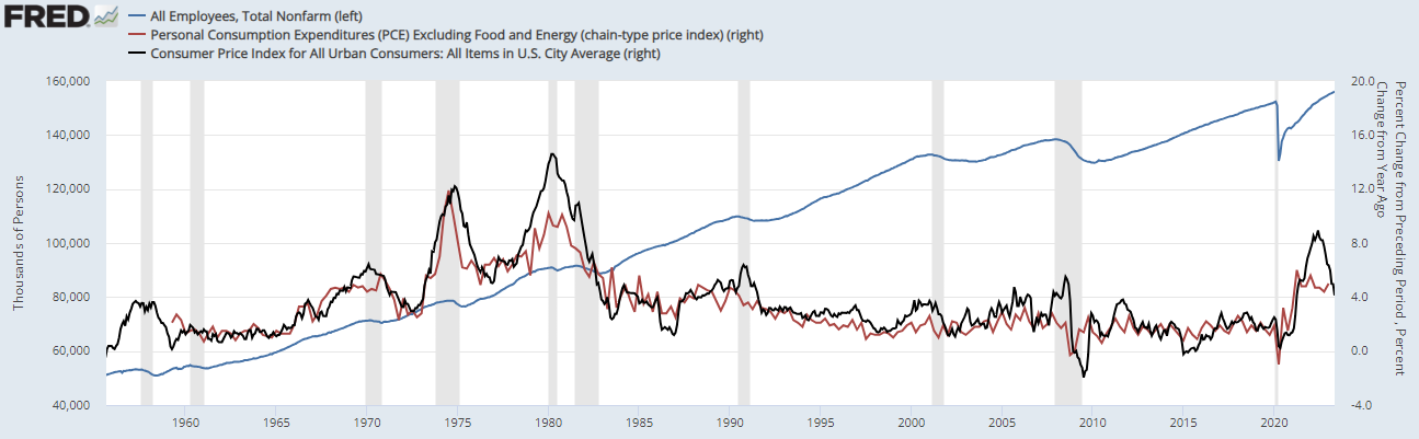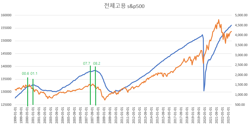 1973년,76년, 2022년 같은 경우는 고용이 증가함에도 높은 인플레때문에 급격한 금리인상을 해서 주가지수는 하락했습니다.