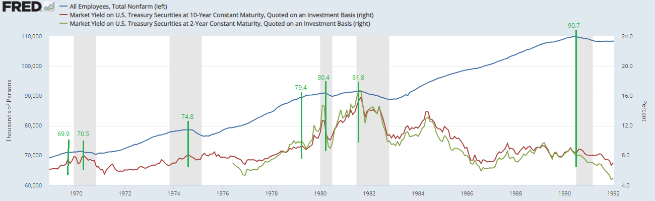 1970년대는 고용감소에도 금리인상을 해서 고용감소에도 시장금리가 상승하기도 했습니다.