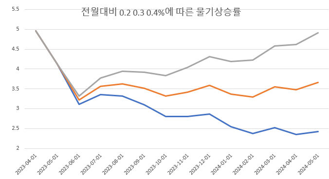 전월대비 0.2 0.3 0.4%에 따른 향후 물가상승률 경로를 그렸습니다.