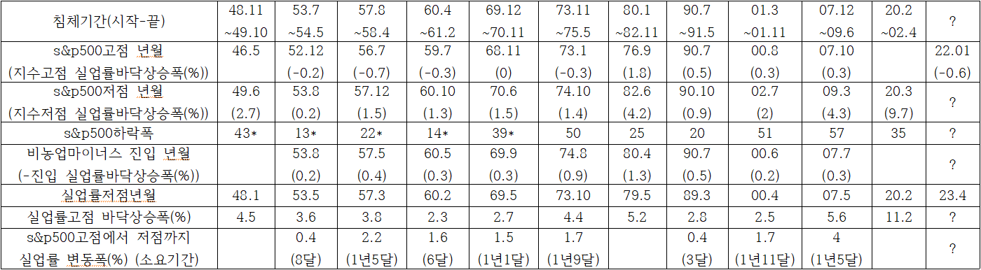표를 보시면 고용감소가 나타날 때와 침체기간 시작이 시기적으로 비슷합니다.