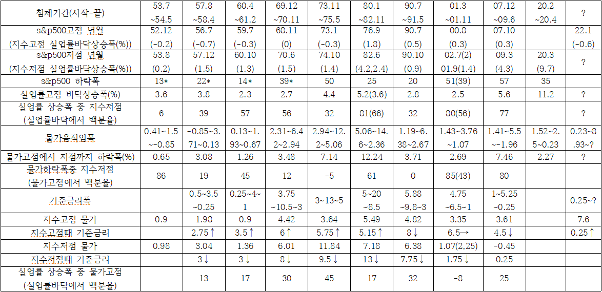그러나 1990년 후에는 실업률이 바닥에서 실업률 전체 상승폭 80%, 77%나 많이 오르고 물가도 전체 하락폭 중에 85 80%나 되어 많이 하락하고 나서야 주가지수 저점을 찍었는데 왜 이런 차이가 나는 가에 대한 의문이 생깁니다.
