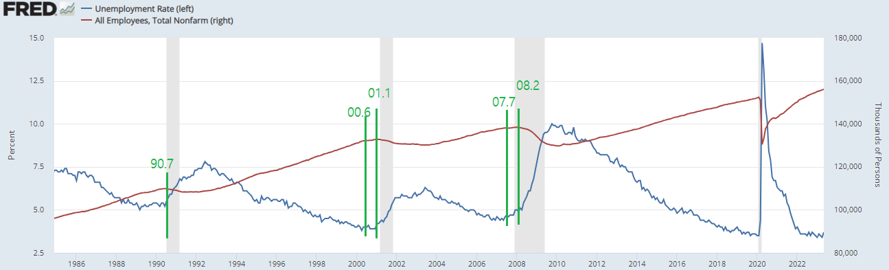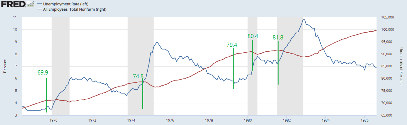 1979년4월에 첫 비농업고용지수 마이너스는 다른 때와 비슷하게 실업률 상승 초반에 있었지만 이후 실업률 상승에도 고용은 계속 증가하였습니다.