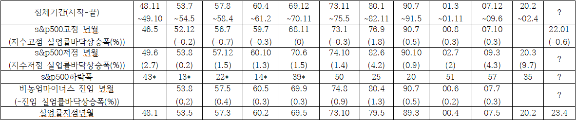 표를 보시면 최근에야 지수하락기간과 침체기간이 비슷한 것을 볼 수 있습니다.