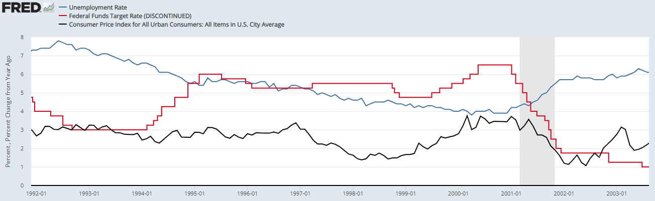 1994년은 1970년대,80년대초와 1990년의 인플레이션으로 크게 디었던 때여서 물가가 3%를 넘지도 않았는데 기준금리를 1년동안 3%에서 6%까지 무식하게 올렸습니다.