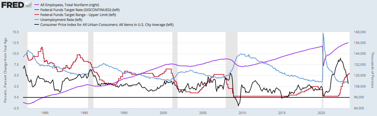 그래프를 보시면 물가가 문제가 되었을 때 본격적인 고용 감소가 있으면 금리인하를 시작했음을 볼 수 있습니다.