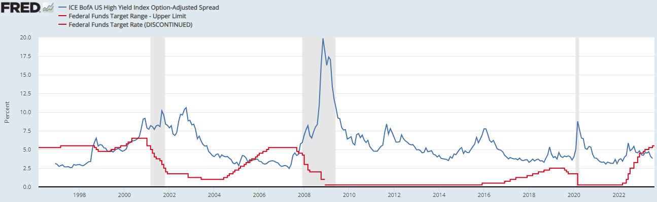 올해 3월 은행위기가 있어서 하이일드스프레드가 5%이상 치솟을 때 시장은 1989년, 2018년, 2008년 금융불안할때 금리인하를 가져간 것을 생각해서 연방기금리선물시장에서는 올해 하반기부터 금리인하를 배팅하고 시장금리는 많이 하락하였습니다.