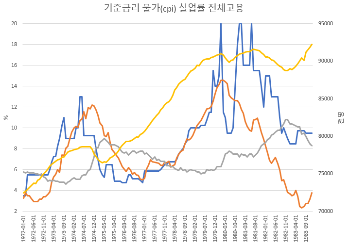 1980년대 초에도 고용감소되고 물가하락하면서 금리인하를 가져갔는데 이때는 물가보다 기준금리가 훨씬 높았습니다.