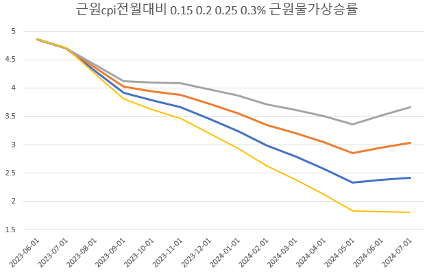 전월대비 0.2%가 계속 나올 경우 내년 봄에 근원물가상승률이 3%이하에 접어들 것 같습니다.