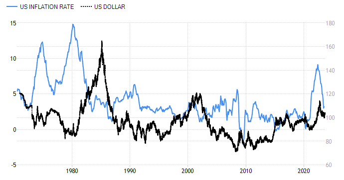 2022년에도 2020년 코로나로 인한 통화완화정책, 재정정책으로 인플레이션이 발생하자 이를 잡기 위해서 긴축을 예고하고 급격히 금리인상을 해서 강달러를 일으켜 물가가 하락한 것을 볼 수 있습니다.