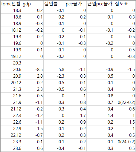 저는 경제전망에서 추세를 봐야 하지 않나 해서 그 위의 표에서 전fomc에서 상향된 전망, 하향된 전망에 따라 변화된 수치를 적었습니다.