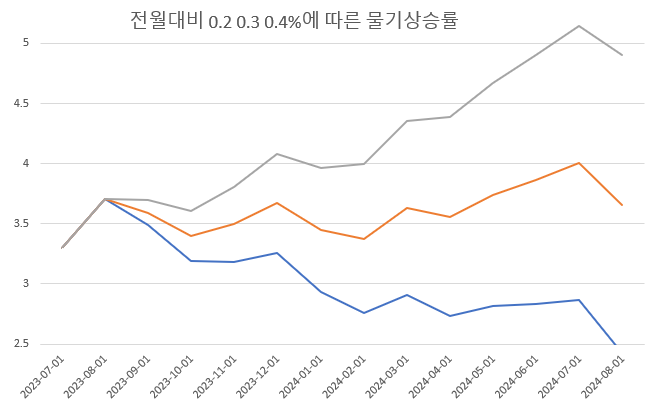 cpi전월대비 0.2 0.3 0.4%에 따른 물가상승률 예측 경로를 보면 cpi전월대비 0.2 0.3 0.4% 모두 9월(10월 발표),10월(11월 발표) 물가상승률은 내렸다가 11월(12월 발표) 12월(1월 발표) 물가상승률은 오르는 것을 볼 수 있습니다.