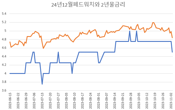 11월3일에 고용보고서가 예상보다 안 좋게 나오면서 시장은 내년 기준금리를 4.5%로 보고 있습니다.
