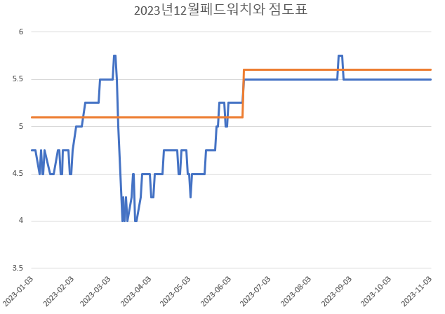 올해 3월 은행위기가 와서 시장은 연준이 금리인상을 못한다고 봤다가 2023년12월 페드워치가 나중에 점도표에 수렴한 것을 볼 수 있습니다.