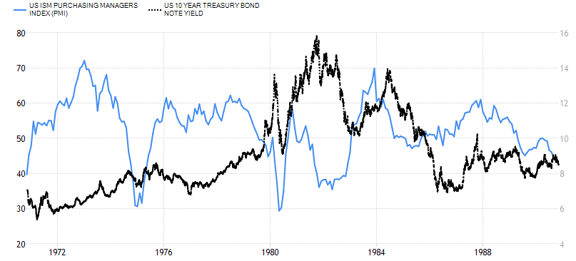 그래서 물가안정시기에는 제조업경기를 나타내는 pmi가 시장금리와 흐름이 비슷하게 가게됩니다.