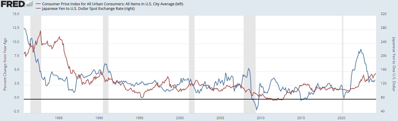 그래프를 보시면 엔강세로 가려할 때인 엔달러 고점일 때 미국 물가가 낮음을 볼 수 있습니다.