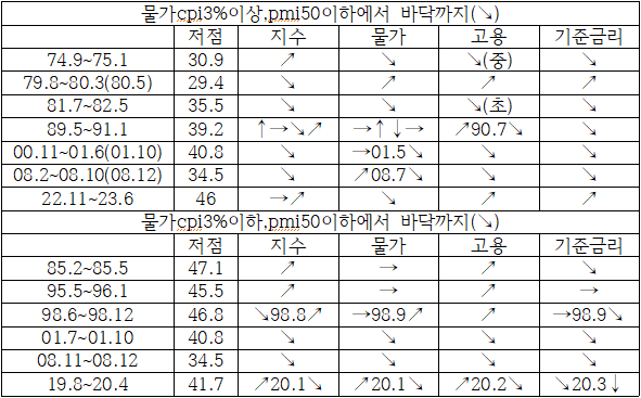 물가 3%이하에서 pmi가 50밑으로 내려가고 나서 바닥을 찍기 전까지 년월도 기록하였습니다.