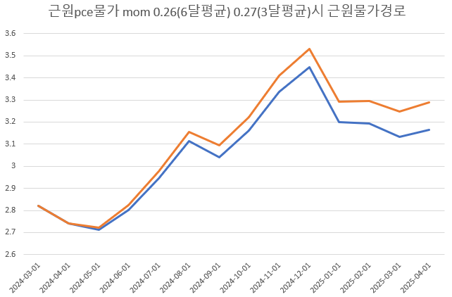 즉 최근 3개월 평균 근원pce물가 mom은 0.27%라 할 수 있습니다.