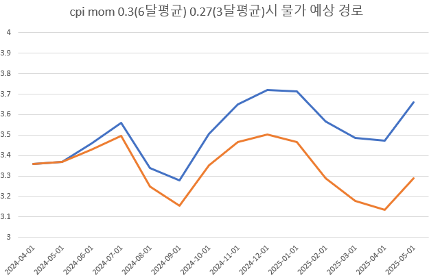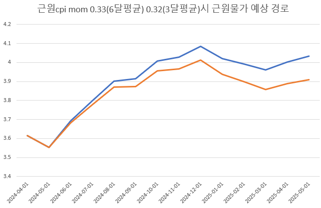 어제 나온 데이터에다 인플레나우캐스팅 어제 5월 cpi mom 0.12%, 근원cpi mom 0.3% 넣어서 물가예상경로를 그려봤습니다.