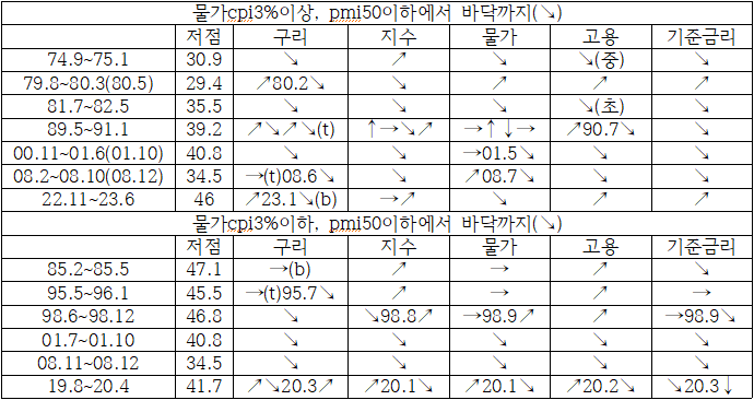 물가3%이하에서는 경기가 상승하려하는 82.5~83.1, 01.10~02.1, 08.12~09.7, 20.4~20.5때는 구리가격이 물가3%이상때처럼 횡보한 것이 아니라 상승하였습니다.