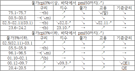80.5~80.8은 강한 긴축 중간에 잠시 기준금리를 내릴 때인데 강한 긴축으로 구리가격이 하락하는 중간에 금리인하로 구리가격이 하락을 멈추고 횡보하였고 이때 물가하락 금리인하 효과로 지수는 상승하였습니다.