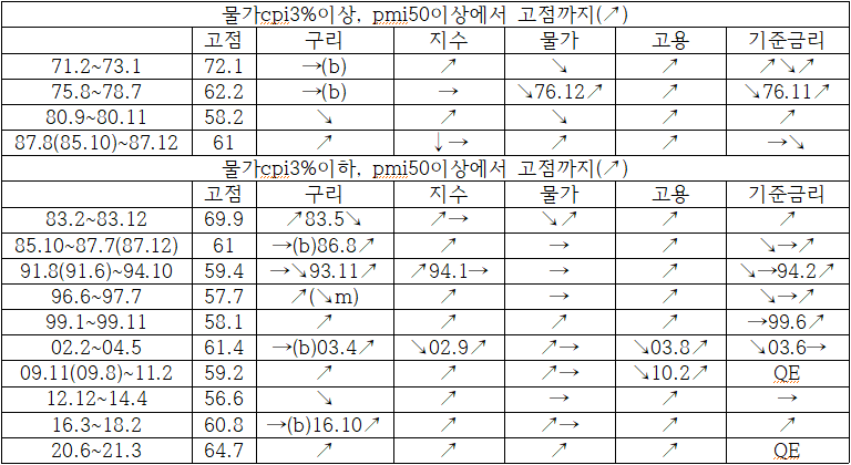 물가 3%이상에서 pmi가 50위에서 상승하면 경기 상승으로 주가지수는 상승해야 할 것 같은데 표를 보시면 상승하지 못하고 횡보하였습니다.