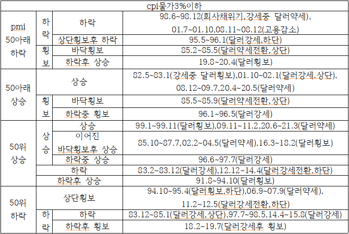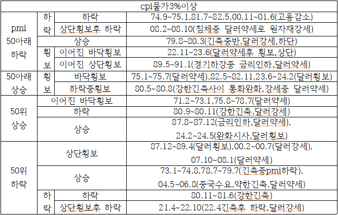 1. pmi50위 상승일 때 물가3%이상에서는 이상하게도 구리가격 상승이 힘들었습니다. (71.2~73.1,75.8~78.7, 80.9~80.11)