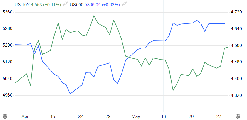 그러다 금리인하시사가 물가를 자극하자 2024년4월 파월이 금리인상에 제동을 걸면서 4월에는 10년물금리와 주가지수간의 역의 관계가 형성된 것을 볼 수 있습니다.