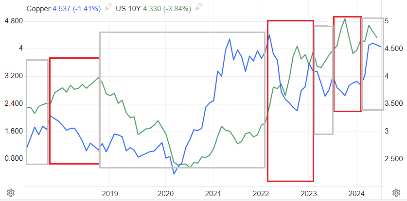 2023년 은행문제가 수면아래로 가라앉으며 연준이 긴축을 표명하자 10년물 금리와 구리가격의 역의 관계가 형성된 것을 볼 수 있습니다.