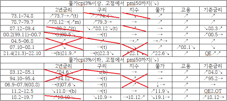대부분 pmi가 50이하에서 하락할 때는 침체가 오고 지수가 하락해서 다들 침체를 예상했지만 이때는 약한 금리인상, pmi50이하 하락에도 물가하락의 지수상승요인으로 지수가 횡보하고 이후 상승하였습니다.