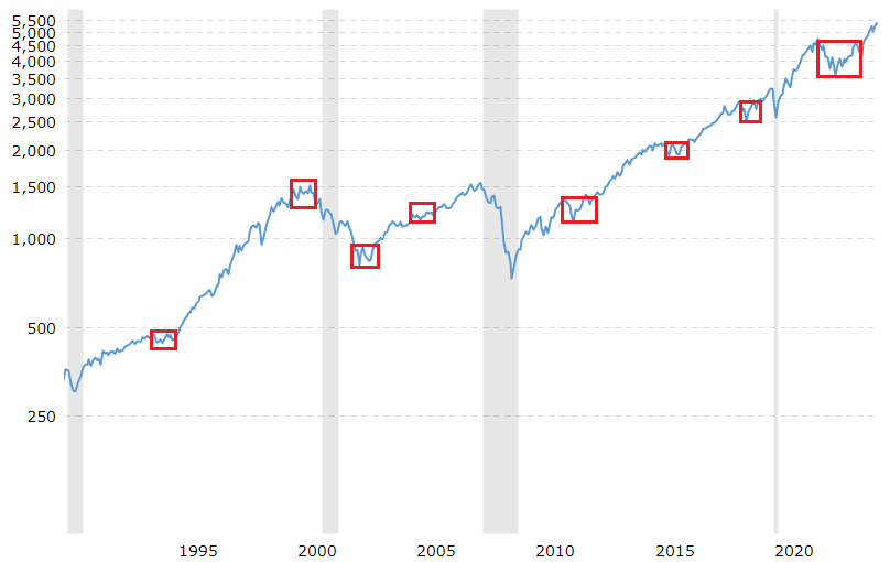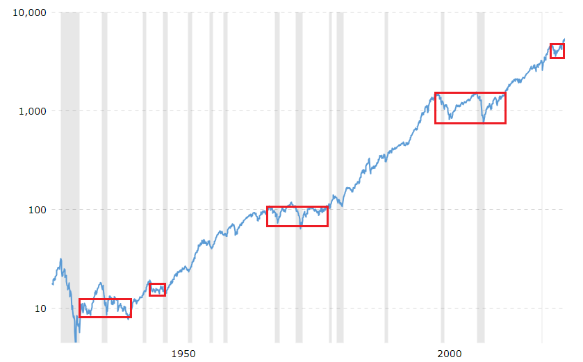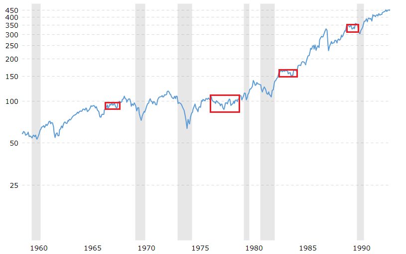 s&p500은 지난 90년 동안 거의 우상향하였는데 빨간 박스처럼 10년에서 15년 횡보한 장도 있습니다.