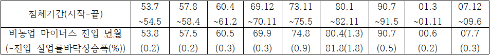 그런데 표를 보시면 73, 80, 81년 초인플레 시절에는 실업률이 바닥에서 0.9%, 1.3%나 올라와서야 비농업고용지수가 마이너스에 진입한 것을 볼 수 있습니다.
