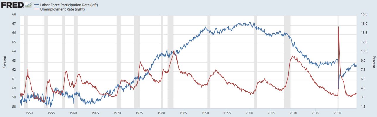 그림을 보시면 노동참가율이 증가하다가 멈출 때나 멈추고 횡보할 때 실업률이 상승하는 것을 볼 수 있습니다.