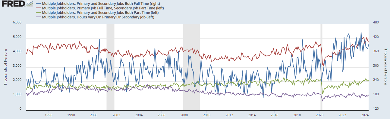 24년5월에 주35시간이상 정규직 일자리가 2개인 사람이 40만명, 정규직 일시직 다 있는 사람이 473만명, 임시직이 다수인 사람이 209만명, 시간이 다양한 다직업자 108만명입니다.