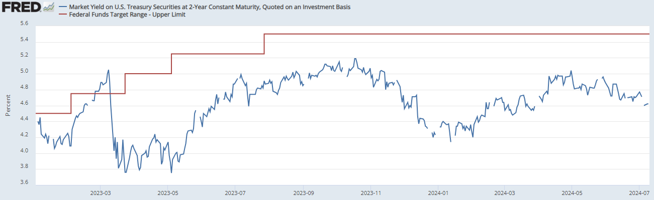 2023년 이후 2년물 금리가 상단에서 박스권을 이루었는데 페드워치를 같이 보며 애기해보고자 합니다.