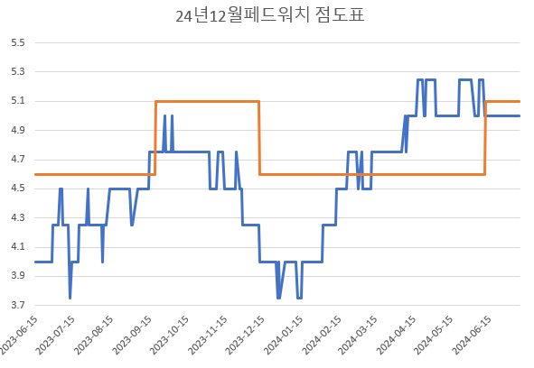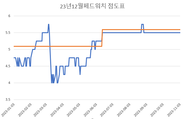 23년3월에 2년물금리 일종가가 5.09 고점을 찍을 쯤에 23년12월 페드워치는 5.75%가 다수로 당시 기준금리에서 금리인상을 4번 반영까지 하였습니다.
