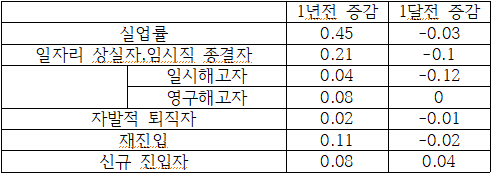실업률이 1년 전에 비해 증가 0.45 했고 일자리 상실자, 임시직 종결자는 0.21 증가, 영구해고자는 0.08 증가, 일시해고자는 0.04 증가하였습니다.