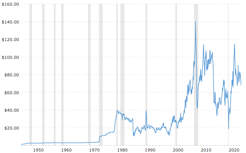 유가인데 위는 명목가격이고 아래는 물가를 고려한 인플레조정 가격입니다.