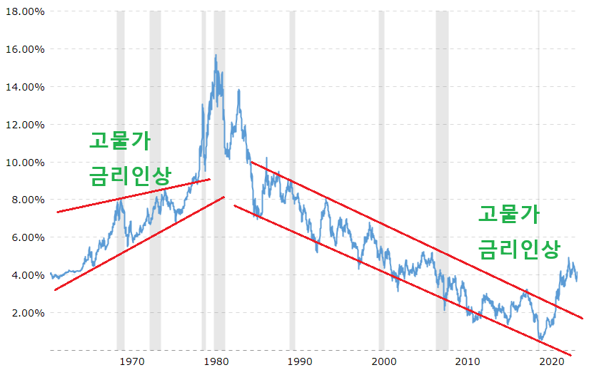 길게 추세안에서 움직이던 10년물 금리가 초고물가로 인한 금리인상으로 1980년, 2022년에 추세선 상단을 벗어난 것을 볼 수 있습니다.