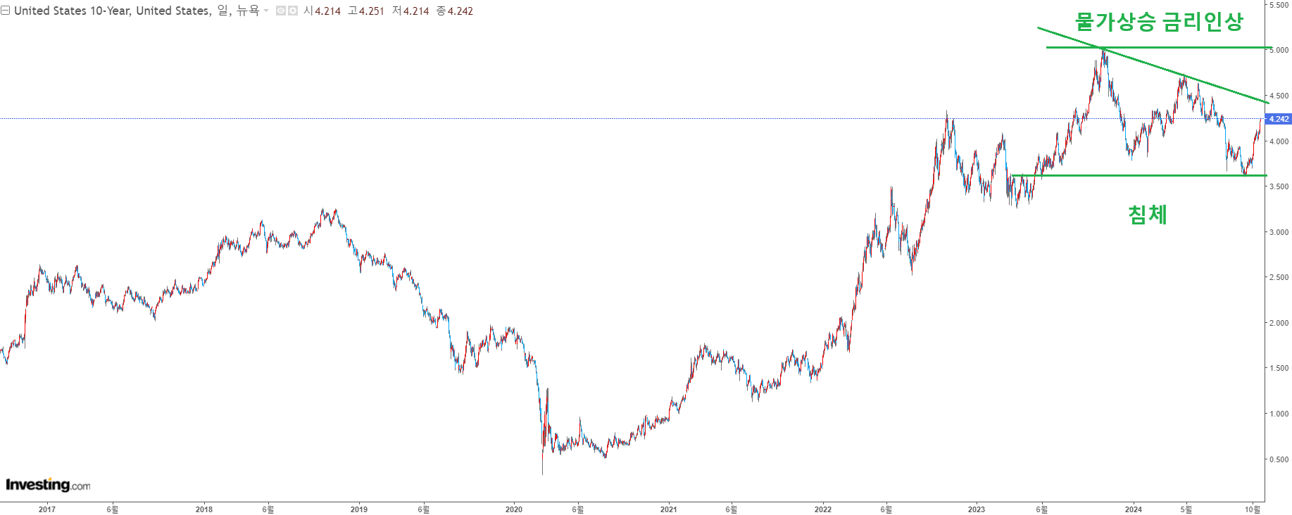 향후 10년물 금리는 침체가 온다면 현재 박스권 아래로 벗어나고 만약 물가가 상승해서 금리인상을 한다면 5%까지 가거나 나 그이상도 벗어날 수 있습니다.