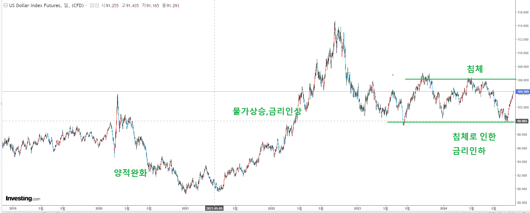 달러인덱스인데 위 그래프가 2019년까지 밖에 안나와서 밑에 2019년 이후 그래프도 가져왔습니다.