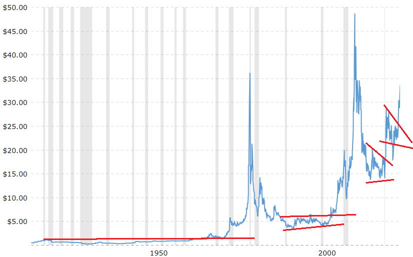 은 그래프도 금과 비슷한데 금과 다르게 크게 치솟을 때가 있는데 투기수요때문인 것 같습니다.