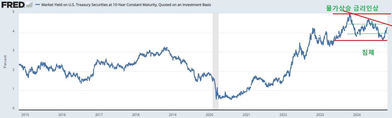 보통 10년물 금리가 침체나 물가상승 같은 경우 아니면 박스권안에서 움직이는 경향이 있는데 지금은 3.5%~5%안에서 움직였고 침체나 물가상승 같은 이벤트 아니면 이를 벗어나지는 않을 거라 생각합니다.
