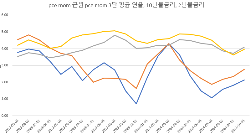 그림은 cpi mom 3달 평균, 근원cpi mom 3달 평균, pce물가 mom 3달 평균, 근원pce물가 mom 3달 평균을 연율 환산해서 그린 것입니다.