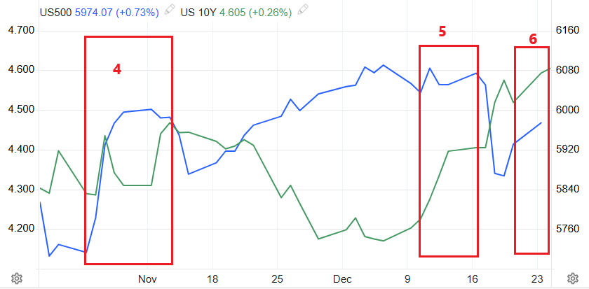 2023년까지 인플레가 문제가 되어서 10년물금리와 주가지수가 역의 관계를 이루다가 2024년 들어오면서 깨지는 순간이 6번 나타났습니다.