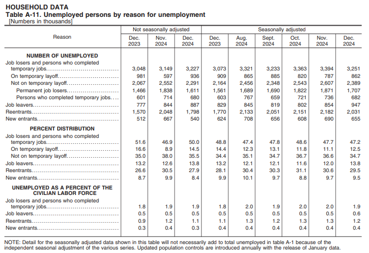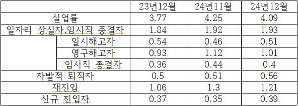24년12월 4.09% 실업률에서 일자리 상실자, 임시직 종결자가 4.09중에 1.93에 해당됨을 볼 수 있습니다.