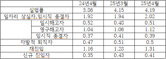 25년4월 4.19% 실업률에서 일자리 상실자, 임시직 종결자가 4.19중에 2.02에 해당됨을 볼 수 있습니다.