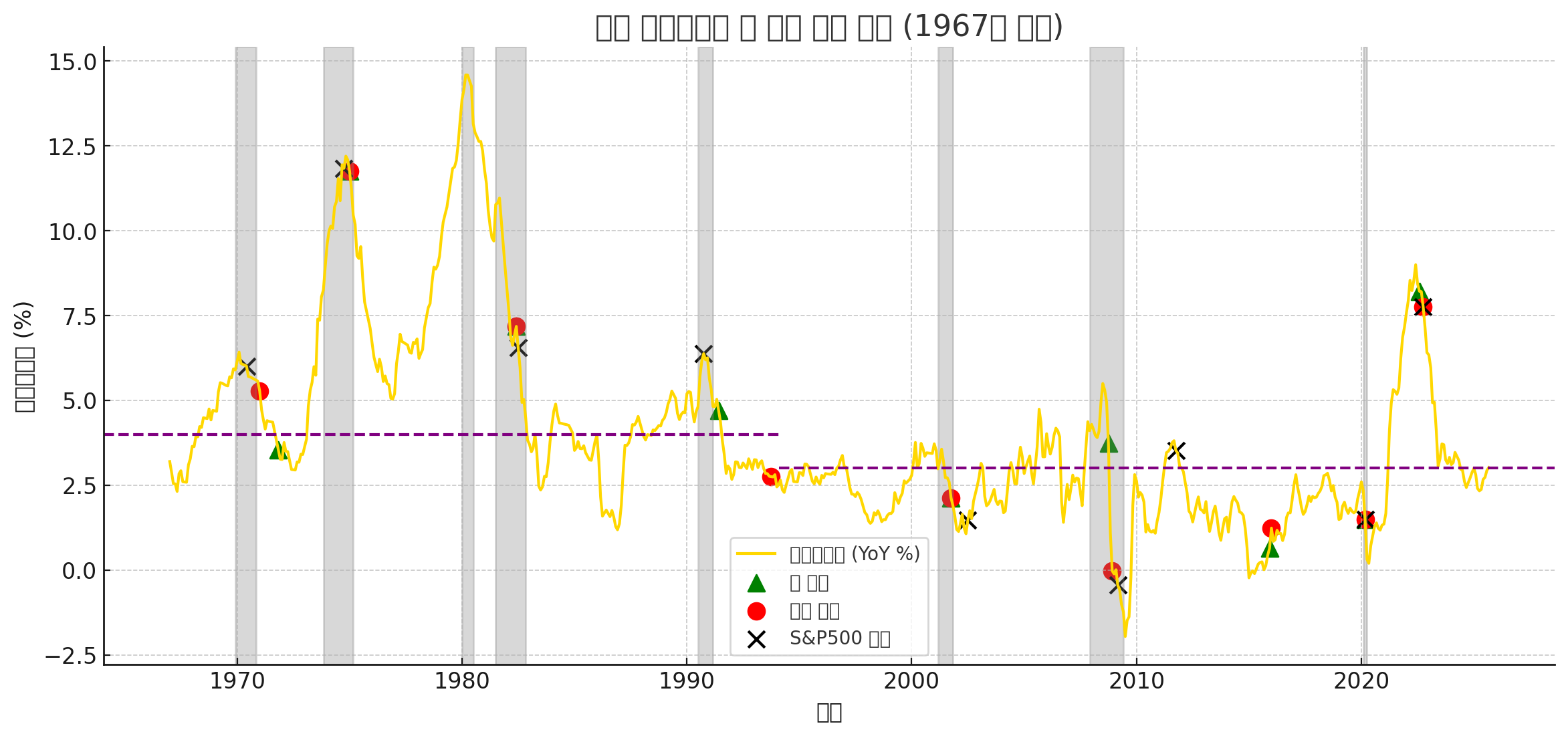 인플레가 문제가 될 때는 물가 고점에서 주가지수 저점이 형성되는 것을 볼 수 있습니다. 1970년,74년,90년,2022년이 그랬습니다.