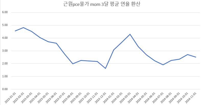 연준은 침체가 없으면 기준금리를 결정하는데 근원pce물가 mom 3달 평균 연율 환산을 보는 걸로 추정됩니다. 위 그림은 근원pce물가 3달 평균 연율 환산입니다. 23년 4분기에 연준의 물가목표인 2%에 가까와지자 12월에 금리인하를 예고하였습니다.통화완화 전환으로 인해 24년1분기에 근원pce물가 mom 3달 평균 연율 환산 물가가 4%로 치솟자 금리인하에 제동을 걸었습니다.이후 근원pce물가 mom 3달 평균 연율 환산 물가가 2%를 향하자 금리인하를 예고하고 7월 실업률이 0.2%이상 치솟자 9월 빅컷을 하였습니다.그러다 통화완화로 다시 근원pce물가 mom 3달 평균 연율 환산 물가 2%에서 멀어지자 12월 fomc때 점도표를 상향하였습니다. 다행히 11월 근원pce물가 mom이 0.11%로 낮..
